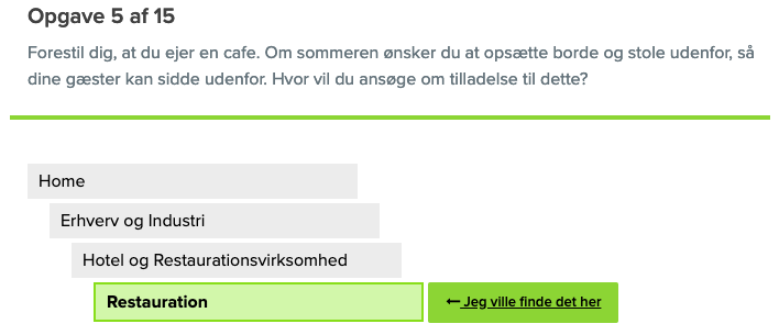 - Lysegrøn: Indirekte succesfuld navigation. Deltagerne har klikket rundt i sitetræet, inden de fandt det rigtige sted.
